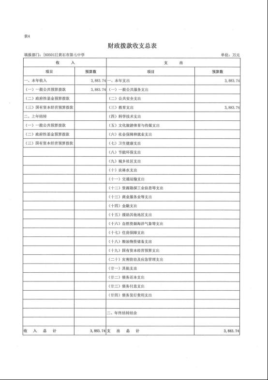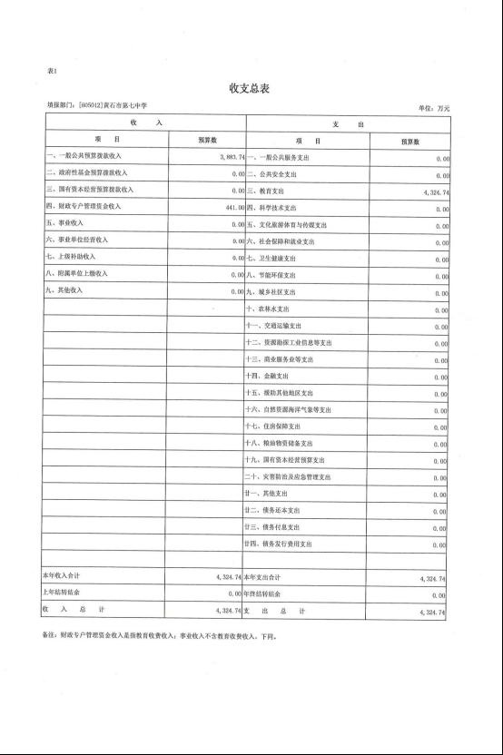 按照综合预算的原则,黄石市第七中学所有收入和支出均纳入部门预算管理。收入包括:一般公共预算拨款收入、政府性基金预算拨款收入、国有资本经营预算拨款收入、财政专户管理资金收入、事业收入、事业单位经营收入、上级补助收入、附属单位上缴收入、其他收入;支出包括:一般公共服务支出、公共安全支出、教育支出、科学技术支出、文化旅游体育与传媒支出、社会保障和就业支出、卫生健康支出、节能环保支出、城乡社区支出、农林水支出、交通运输支出、资源勘探工业信息等支出、商业服务业等支出、金融支出、援助其他地区支出、自然资源海洋气象等支出、住房保障支出、粮油物资储备支出、国有资本经营预算支出、灾害防治及应急管理支出、其他支出、债务还本支出、债务付息支出、债务发行费用支出;2026年度收支总预算 4324.74 万元。